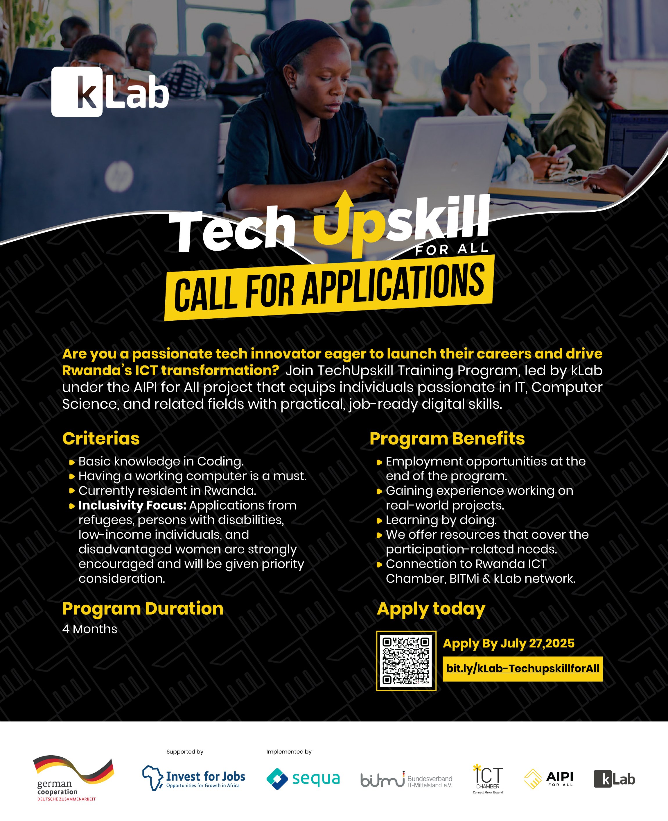 The TechUpskill Training Program, implemented by kLab in partnership with the Rwanda ICT Chamber and the Germany-based IT Association (BITMi), is part of the AIPI for All (Access International Partnership in IT) project. This initiative is designed to equip fresh graduates in Computer Science, Software Development, IT, and related fields with practical, hands-on skills to enhance their employability.