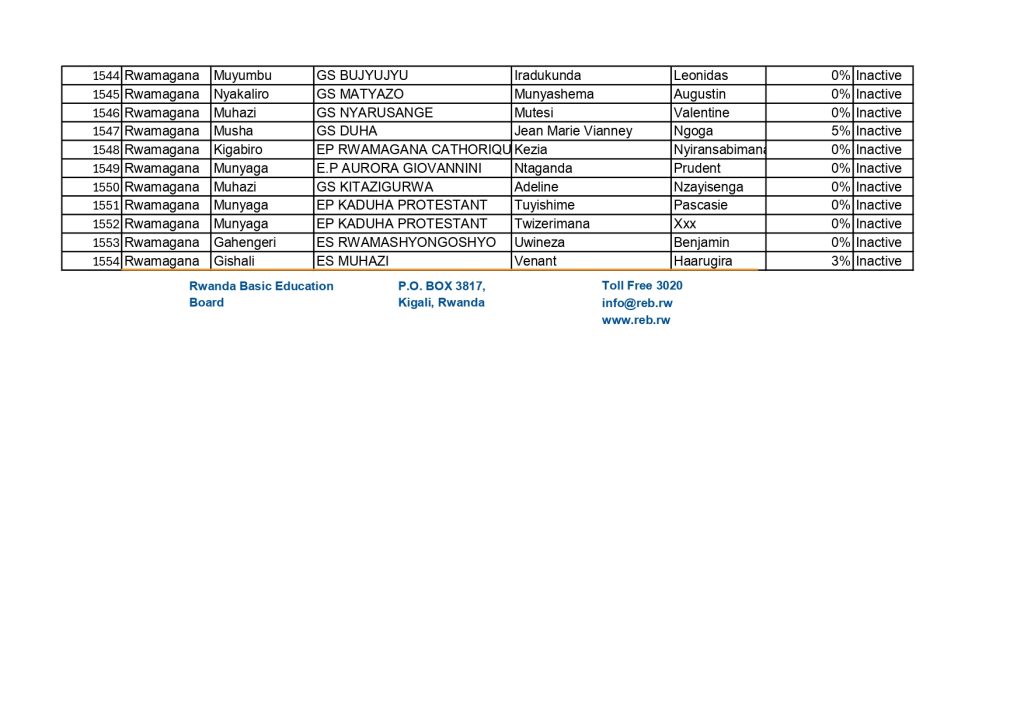 For further inquiries, do not hesitate to contact MUGABONAKE Abdou, English proficiency Specialist at REB on Tel: 0788971401, or Email: amugabonake@reb.rw. and MURASIRA Gerard, Director of teacher training Unit at REB on Tel: 0788625992, or Email: gmurasira@reb.rw